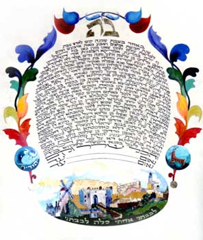 as a rainbow of foliage circles the ketubah. The text may be written straight