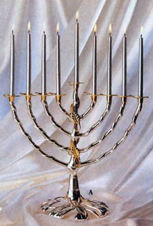 The silver plated Chanukah menorahs designed by Fred Spinowitz for AVIV Judaica.Purchase information may be obtained from any significant Judaica merchant in your area.A mezuzah and Shabbos candle sticks are available in this unique Spinowitz tree of life design. | ||||