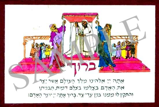 The set of seven cards, each hand colored with slight variation, are approximately 6x8 ounted on mat board. This unusual gift will be appreciated by the newlyweds or the hosts of the sheva brachos meals -$150 -set. | |||||